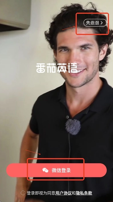 打开app后,你既能够点击屏幕下方选择微信登录,也能点击右上角的“先逛逛”选项。