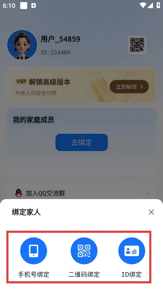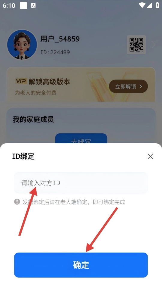 4、填【对方ID】后点【确定】,发起绑定,待老人端确认完成。