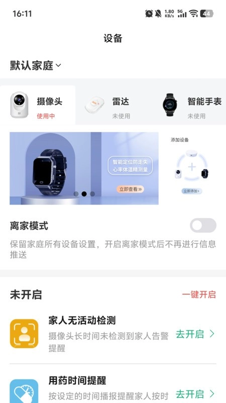 居嘉卫士app作为智能设备的配套软件,绑定成功后,可在手机上实时接收最新异常报警信息。该软件兼容监控摄像头、智能手表、雷达等多种设备,支持同时添加多个设备进行管理,具备远程开启与关闭功能,能切换模式,还提供在线购买对应商品的服务。
