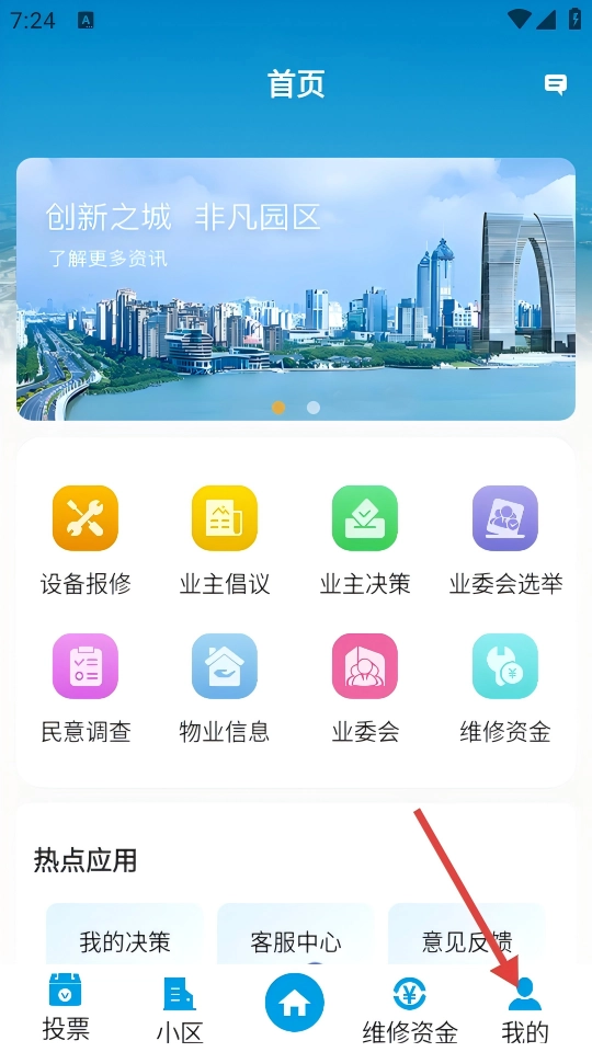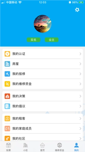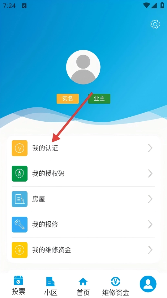 1、首页点【我的】,进入个人功能界面,开启业主认证流程第一步。