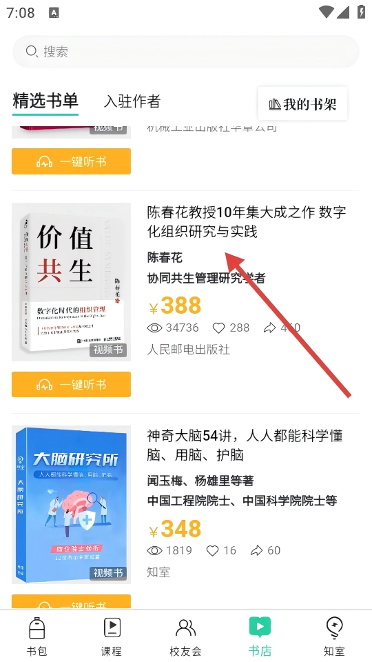 1、知室书院页点【书店】,进入书籍推荐列表,浏览精选书目如【价值共生】。