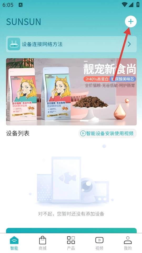 1、进入智能页点右上角【+】,进入添加设备界面,启动设备添加流程。