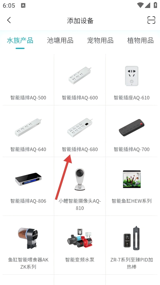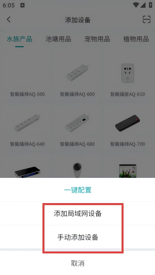 2、在水产品类选【智能插排】,触发底部菜单,准备选择添加方式。