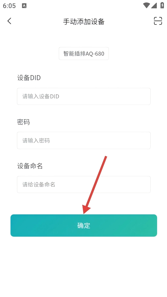 4、填【设备DID-密码-命名】后点【确定】,完成智能插排添加操作。