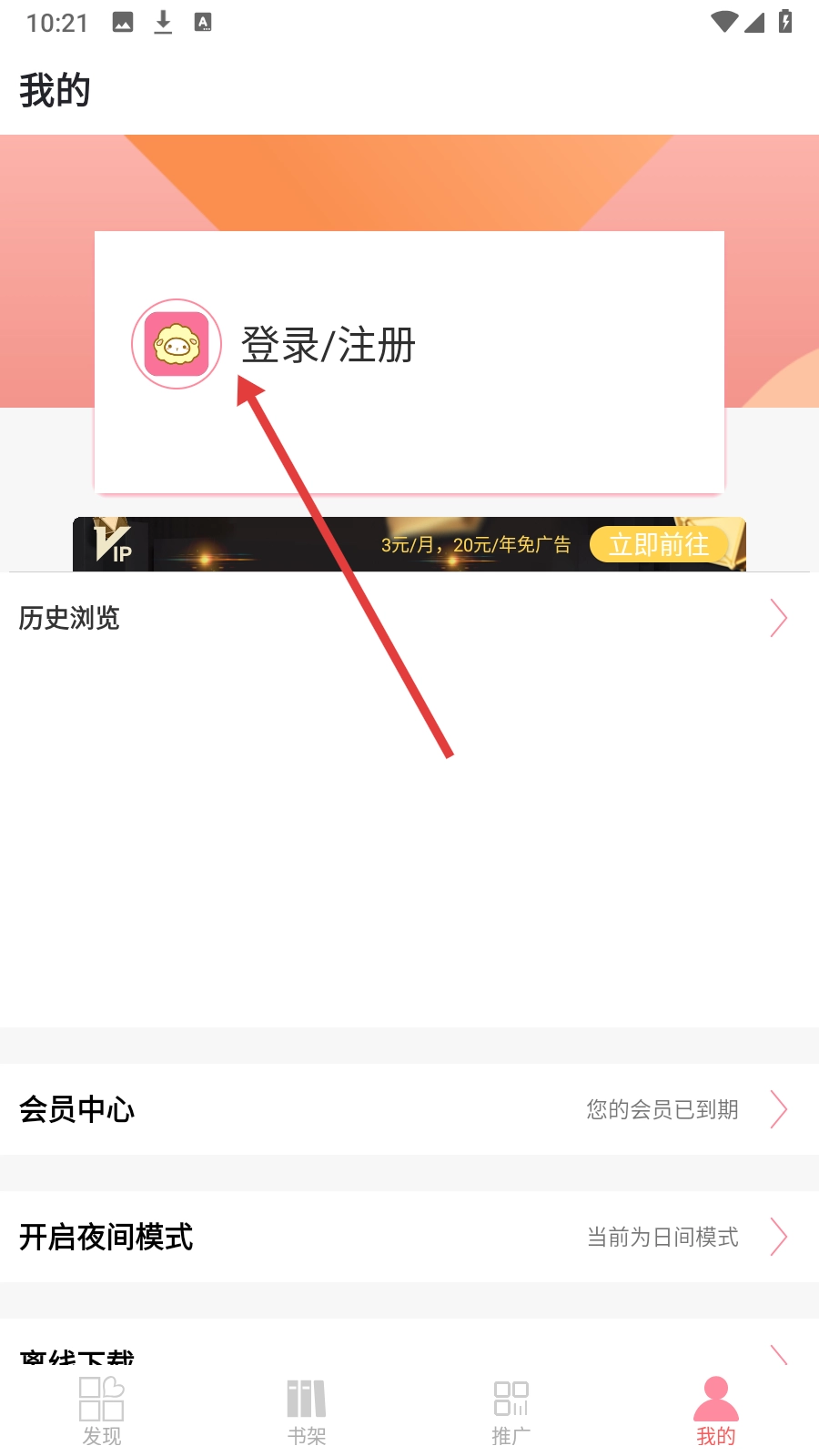 2、我的页面点击【登录/注册】,进入登录注册流程。