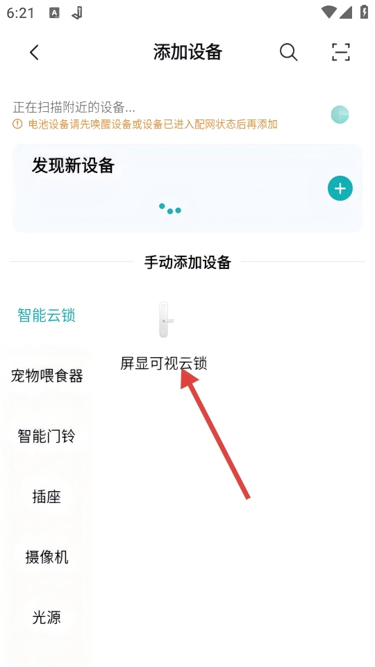 2、手动添加选【屏显可视云锁】,跳转设备上电指导页,准备通电操作。
