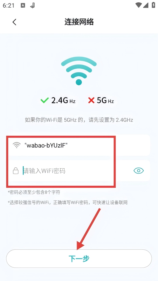 4、选好WiFi,填密码后点【下一步】,完成设备配网。