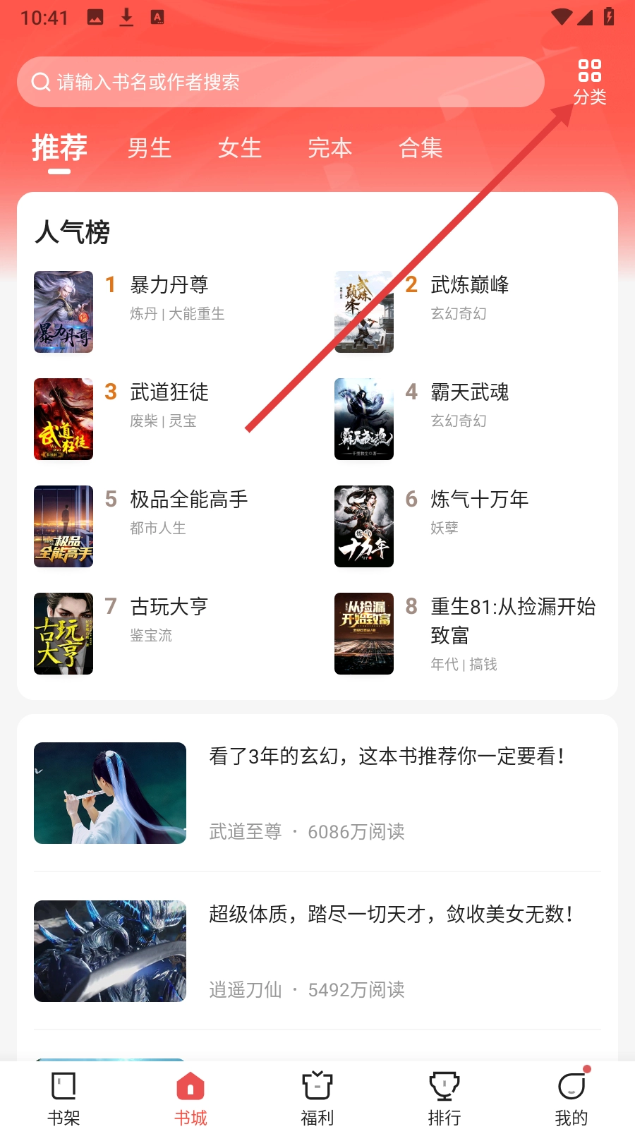 1、书城页点击右上角【分类】,进入书籍分类界面。