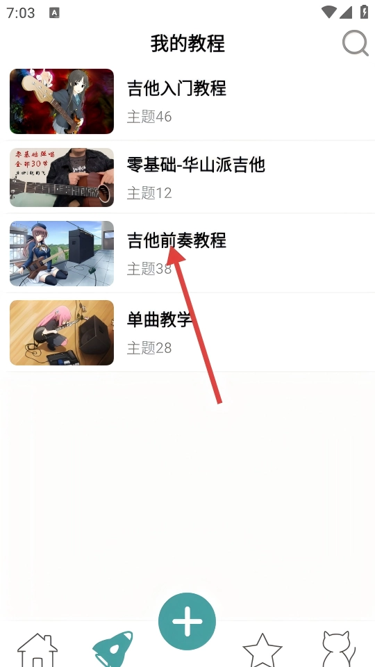 1、首页点击底部【火箭】图标,进入【我的教程】页面,浏览吉他学习课程列表。