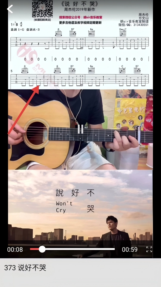 4、观看【说好不哭】教学视频,对照上方吉他谱,跟随演示学习前奏弹奏方法。