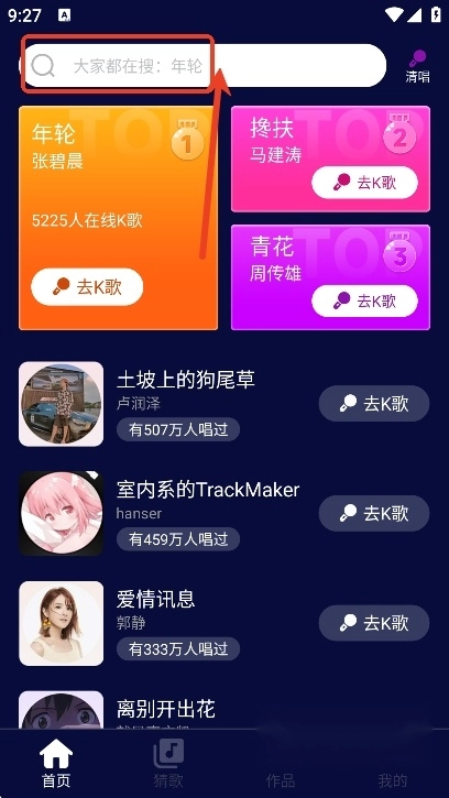 然后用户们可以使用K歌功能,直接在搜索栏搜索自己想要唱的歌曲