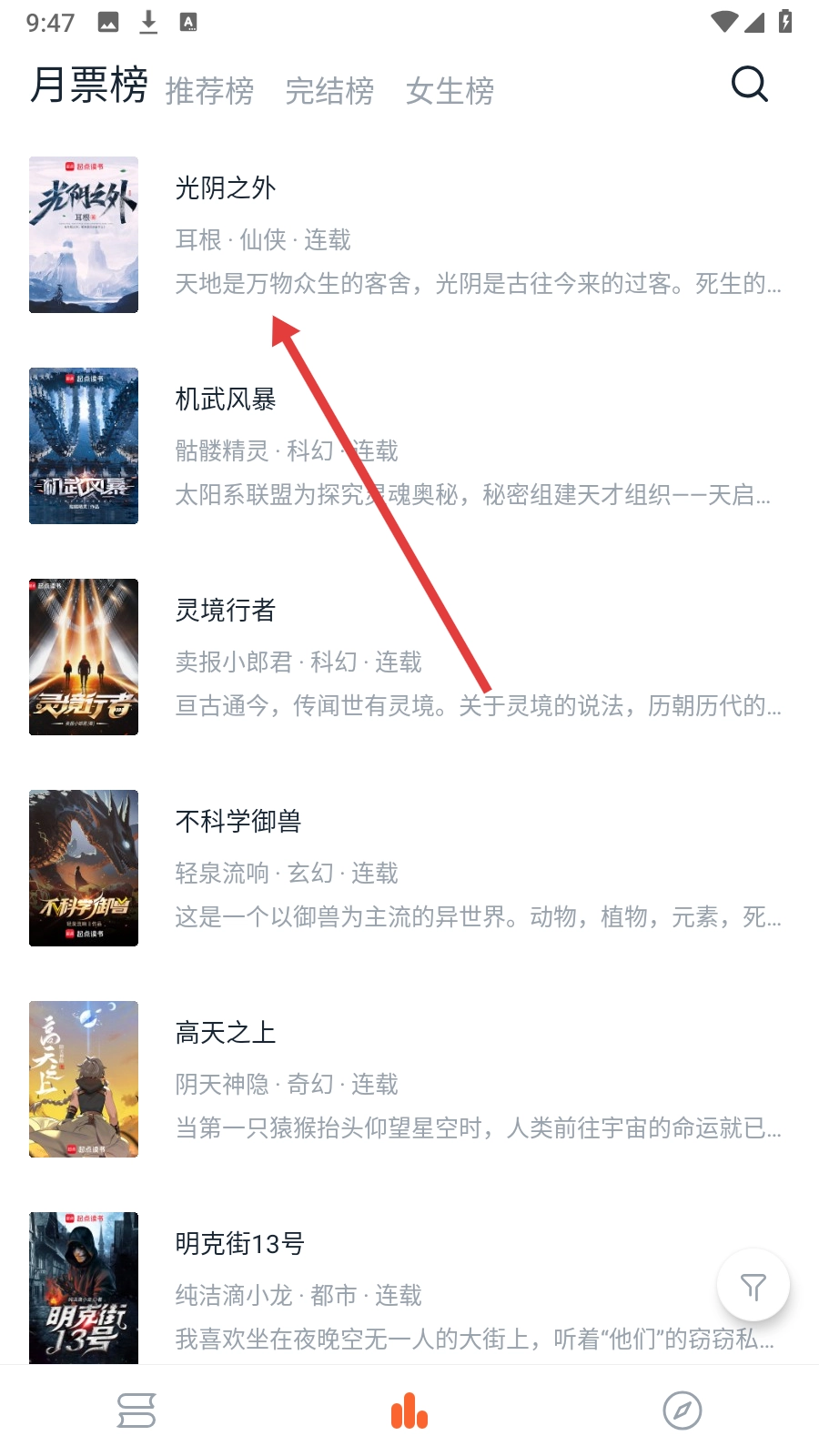 1、书架页点击底部【榜单】图标,进入书籍榜单界面。
