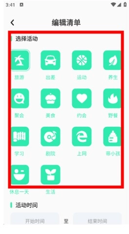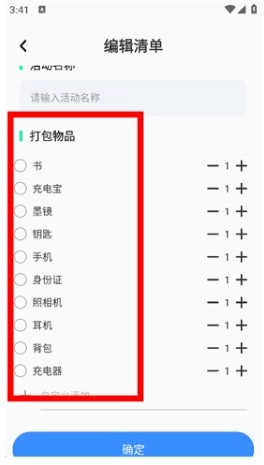 请输入时间、预算以及活动名称,同时对随行物品进行整理。
