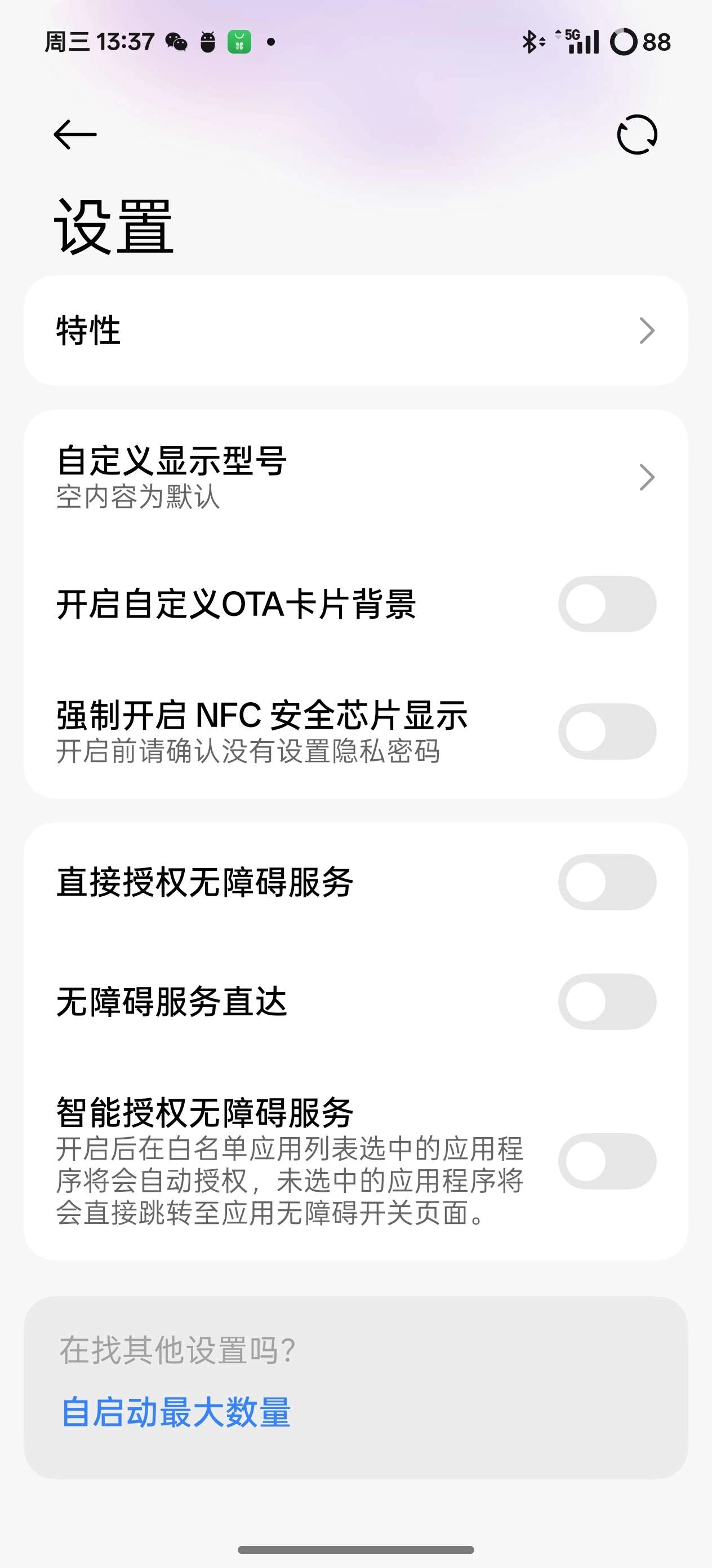 4. 进入设置页面,不仅能够查看设备特性,还能对显示型号进行自定义设置,同时支持开启自定义OTA卡片背景等操作。