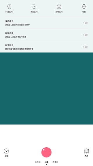4、左上角的按钮可开启【更多设置】,其中包含闪光灯开关、夜拍模式、延时模式、快拍模式、触屏拍摄等功能。