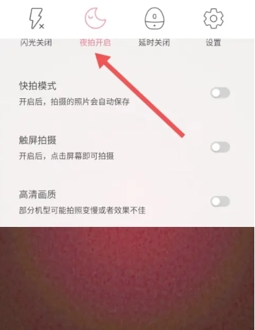 4、点击后,当箭头所指的地方变成【夜拍开启】,夜拍模式就开启了