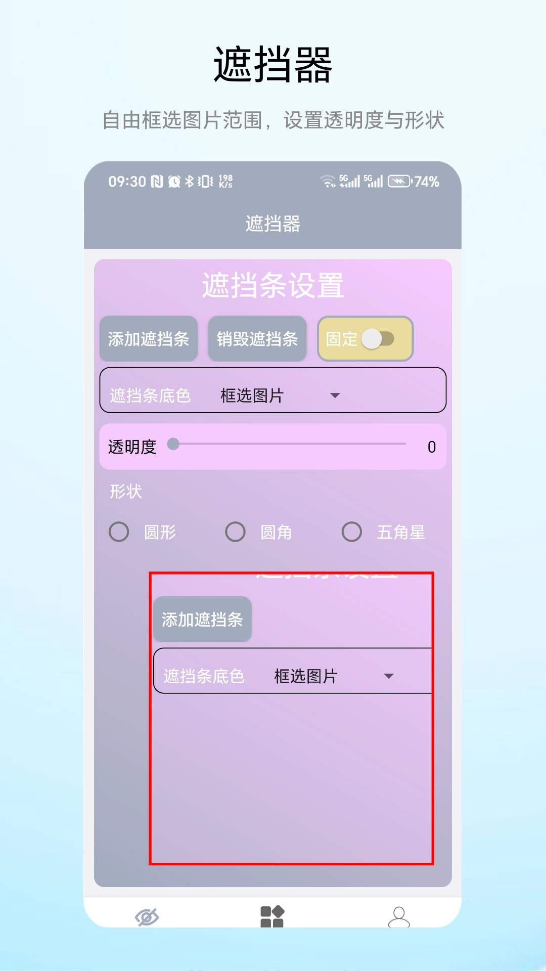 1. 提供框选范围的支持,同时能展示针对指定颜色、图片等的遮挡器。允许一次添加多个遮挡器,并对其规格与透明度进行设置。另外,在设置中还设有自动抠图功能,当添加人像图片时,系统可自动将人像抠取出来。