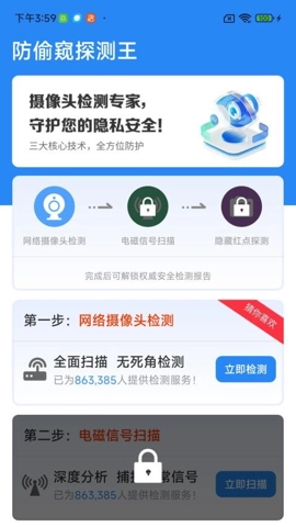 1、在功能方面,防偷窥探测管家APP了多种微型摄像头检测方式。
