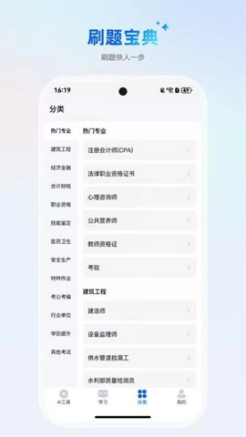 3、AI刷题宝典为契合不同用户的需求,呈现出多种考试领域,用户能够依据自身需求,便捷地挑选对应的考试类别。