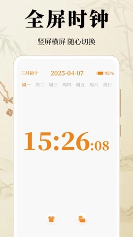1、万年历88日历通APP具备全新数字化时钟显示效果,呈现出多种不同的全屏时钟显示样式。
