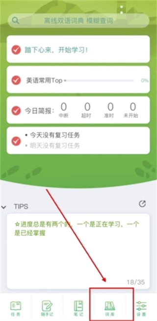 1、下载并安装App后点击打开,第一步需先找到右下方的【词库】。