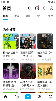 1、首页会推荐各种各样玩家自制的游戏,看到喜欢的点击打开。