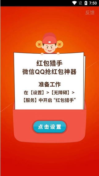 1、大家下载安装好红包猎手最新版本之后,可以打开可以看到一个开启提示,点击“点击设置”;