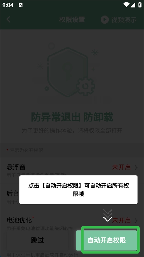 7、接着点击【自动开启权限】,这样就能开启全部权限。