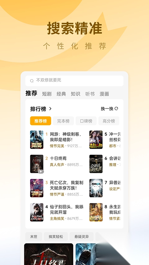 都市爽文、悬疑惊悚、言情穿越、玄幻修仙、武侠世界,还有出版读物等等,分类超全面,让你尽情畅享。