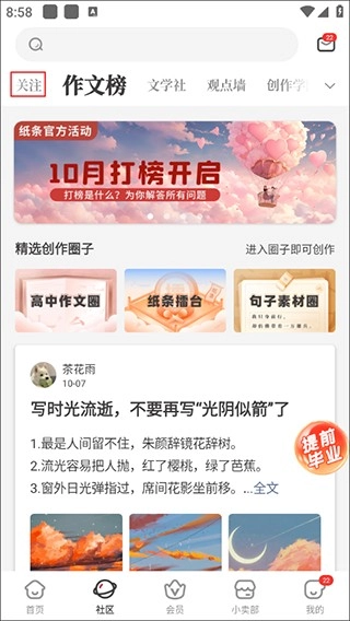 1、在作文纸条安卓版app的主界面上点击“关注”选项;