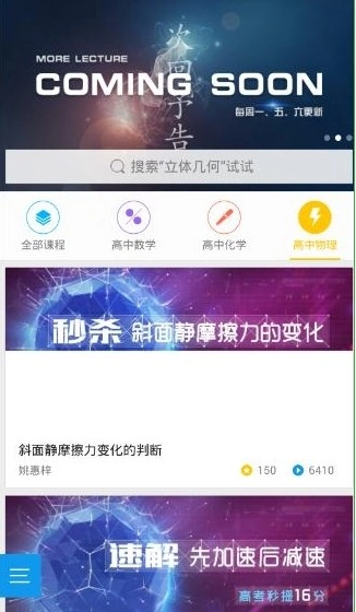 4、进入高中物理栏目,您会发现有众多视频,而且每个视频下方都设有针对相应知识点的真题测验,便于您在学习后即刻通过练习进行巩固。