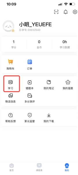 二、进入“我的”页面后,点击页面中间左侧“学习”按钮。