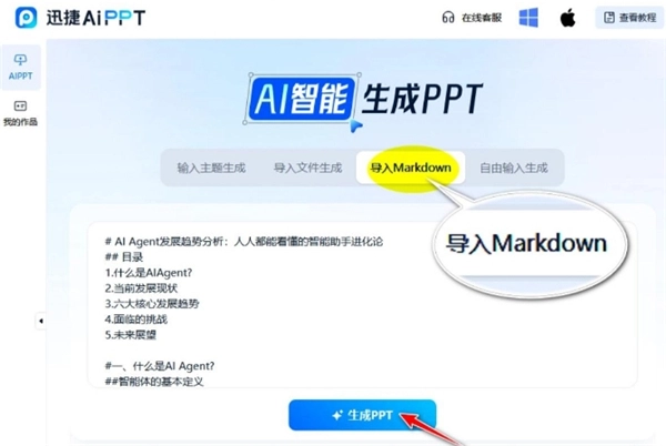 在浏览器中搜索并打开【迅捷AiPPT】官网,将Markdown文档上传至该网站,通过一键转换操作,即可直接生成PPT文稿。