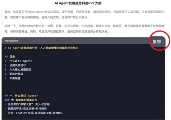 输入指令后,得到markdown格式的内容,点击复制,保存好PPT大纲。