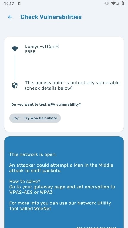 若连接成功,应用将展示连接状态,同时告知用户网络是否存在漏洞。