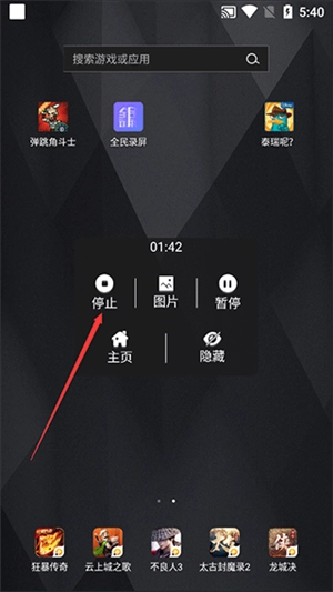 2、进入想要录制的界面,此时悬浮窗会显示五个功能按键,分别为:录制、截图、隐藏、主页、设置。若想录制视频,点击“录制”即可。在录制过程中,再次点击悬浮窗,选择“停止”,录屏便会终止,且系统会自动保存,界面将跳转至视频页面。