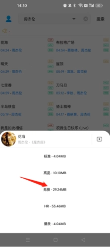 2、找到你想播放的歌曲并点击,接着选择不同音质下载就行。