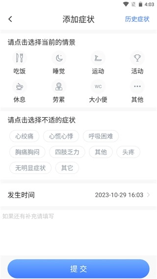 2、于“首页”点击“添加活动或症状”,添加症状有助于更完善地记录日常状况。