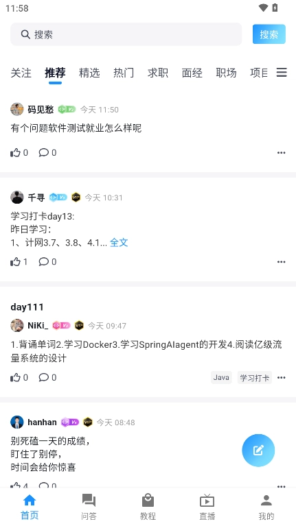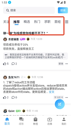 2. 打开并进入软件,在首页能够看到精选、推荐、热门、求职等板块的相关内容。