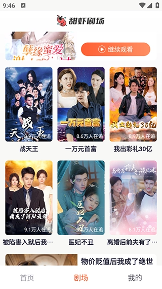 1. 丰富多元的短剧题材:甜虾剧场app囊括了战神、甜宠、悬疑等各类短剧。