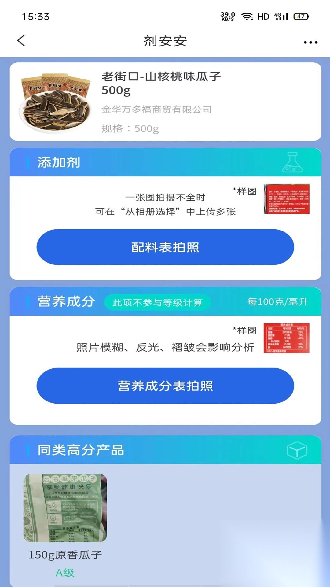 用户仅需扫描商品条形码(并非二维码),并拍摄食品外包装上的配料表与营养成分表后上传,就能获取该食品所含添加剂的安全等级,以及各类营养素含量的评价,从而为用户在购买和食用商品时提供健康方面的建议。