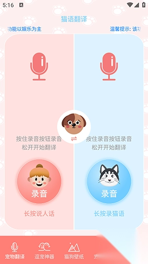 2、用户能够选择录音或者文字输入的形式,把自己想说的话转化为猫语,然后播放给猫咪听。