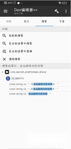 2.用dex++全选dex,搜索代码"全站超级浏览权限"