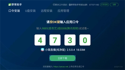 野草助手 U 盘应用 app 需与野草助手 tv 版协同使用,目的是为用户打造更为便捷的电视应用安装体验。借助这款 app,用户能够轻松把野草助手的应用下载至 U 盘,随后安装到电视上,操作便捷且高效。此安装方式省去了在电视端下载软件的繁杂流程,让用户不再为电视应用安装问题而困扰。另外,该 app 虽体积小巧,却集合了最新的口令大全以及丰富多样的电视应用,充分满足用户的多样化需求。