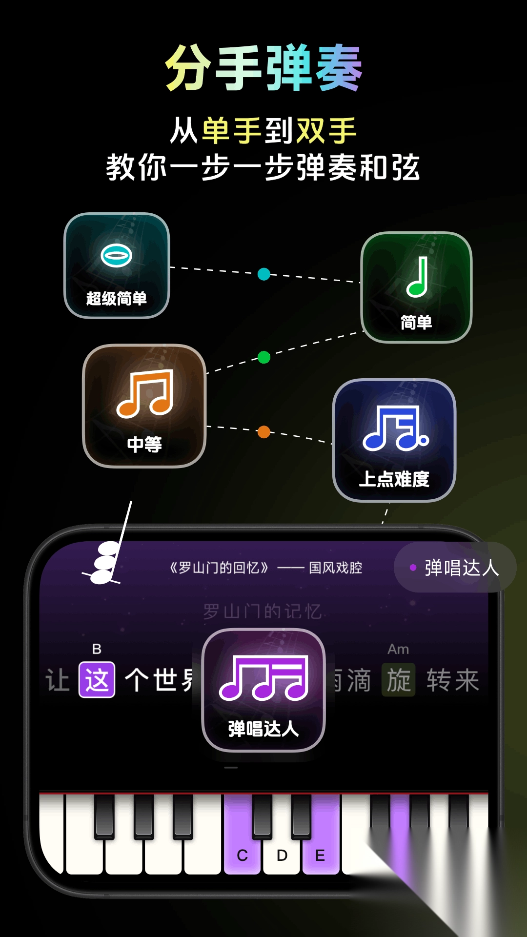 2.一步一步地弹奏和弦,并标记难度级别,方便不同用户学习。