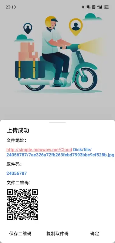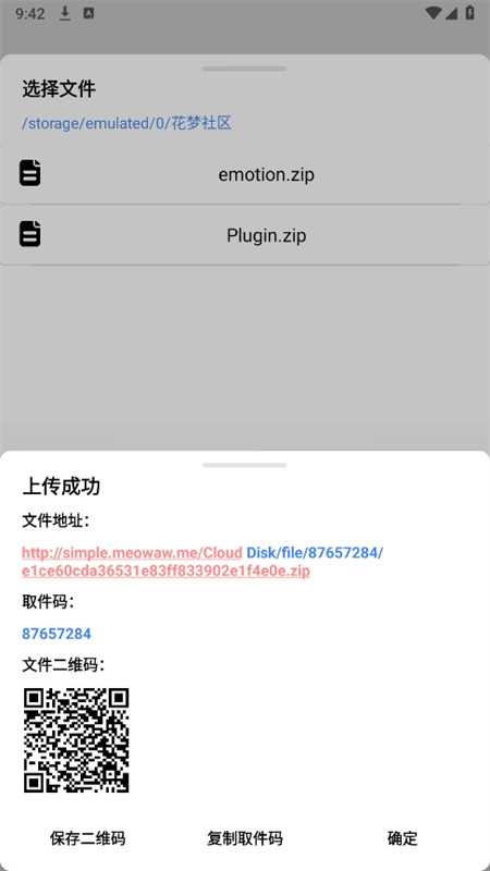 3、这个时候上传成功就会获取一个取件码,还有文件的二维码和地址;