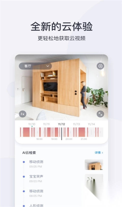 小蚁摄像机App拥有报警推送功能,一旦监控画面识别到异常情况,便会以消息形式通知您。它的报警服务能够识别诸如有人出现、有车出现、宠物出现等各类场景,并对各种录像事件进行分类,便于您快速查找。不仅如此,小蚁摄像机App还支持添加亲情账号,经授权的账号同样能够查看监控画面,在家中有小孩、老人等场景下,就可以将监控画面分享给家中其他用户。
