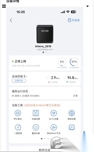 3. 卡片所包含内容如下:设备状态、设备名称(备注)、设备角标(具体有离线、服务异常、Mesh、低版本、生态款等情况)、设备缩略图、上传/下载速度、今日积分、活动打卡状态、连接设备数量、终端列表快捷入口、查看积分快捷入口,单击此卡片可跳转至详情页。