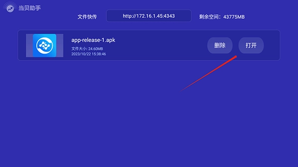4、上传一旦成功,文件会即刻同步至当贝助手。返回当贝助手,就能发现文件已上传完毕,此时点击“打开”,便可安装应用。