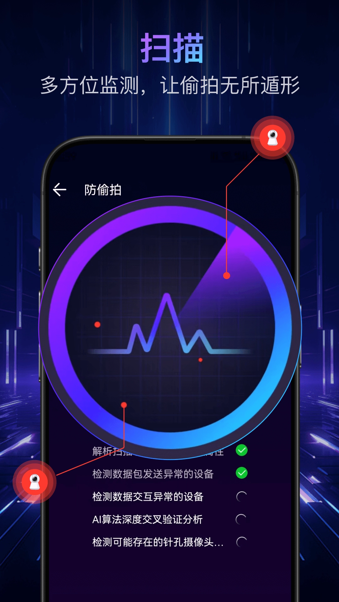 酒店偷拍检测APP,是一款精心为出行人群打造的反偷拍安全利器。它运用智能扫描技术,助力用户排查酒店、民宿、更衣室等地方潜在的针孔摄像头与窃听装置,全方位守护个人隐私安全。该APP融合红外探测、Wi-Fi信号解析、磁场感应等多种技术,能够迅速识别可疑设备,让用户无论是居住还是休息,都能毫无后顾之忧,倍感安心。